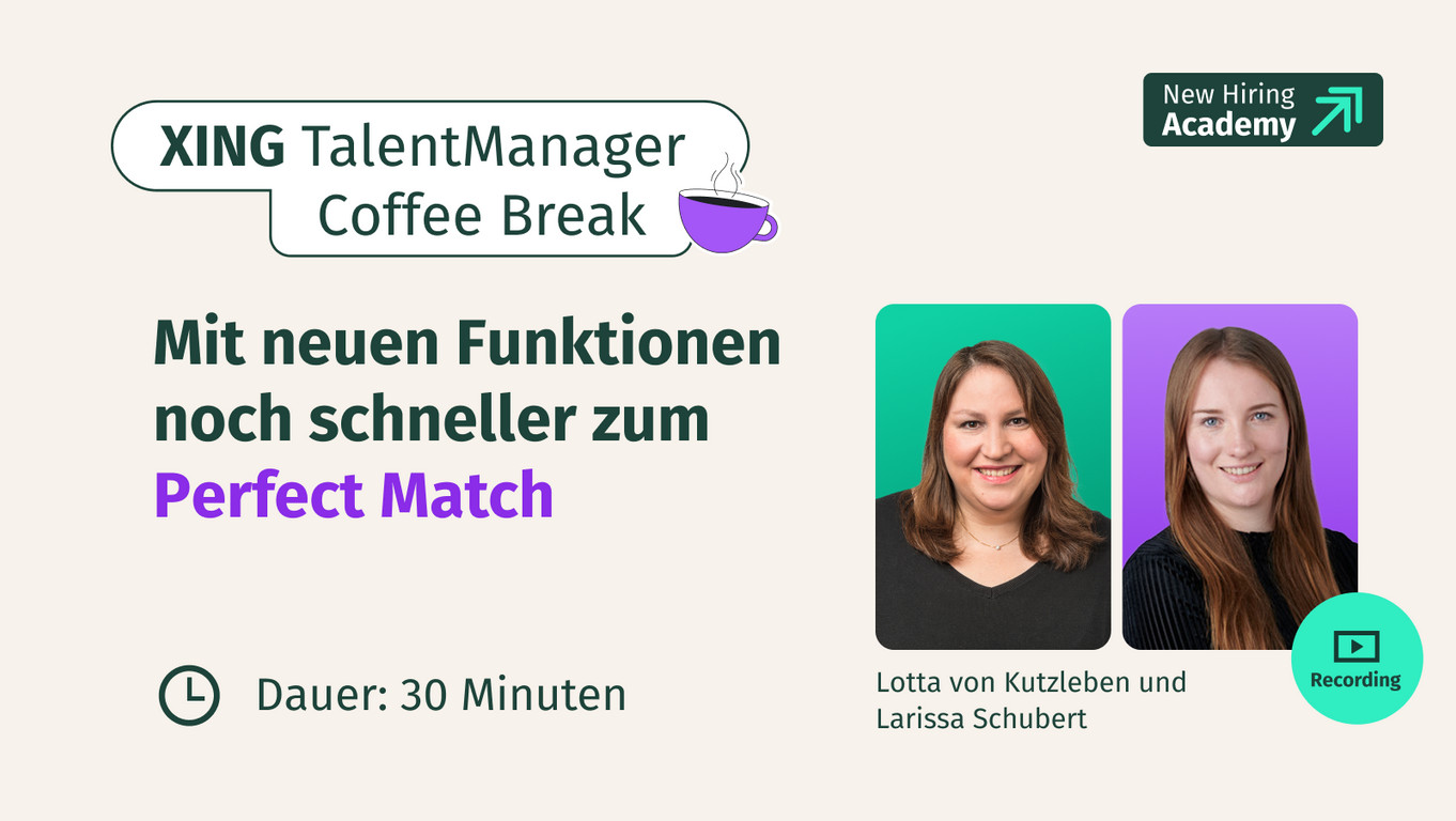 Ab Mai erwarten Sie spannende Neuerungen, die Ihre tägliche Arbeit mit dem XING TalentManager auf ein neues Level heben. Nutzen Sie die Gelegenheit und erfahren Sie in unserer exklusiven XING TalentManager Coffee Break, welche neuen Features Ihnen schon bald zur Verfügung stehen.Lotta von Kutzleben, Senior Managerin Training der New Hiring Academy, spricht mit Larissa Schubert, Senior Product Managerin für Active Sourcing bei XING, über die neuesten Entwicklungen und gibt Ihnen wertvolle Einblicke hinter die Kulissen der Produktstrategie.