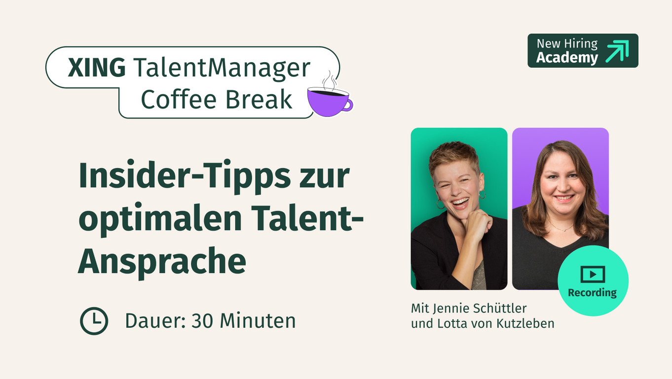 Wie das geht, zeigen wir Ihnen innerhalb einer Kaffee-Länge. Unsere Expertinnen von der New Hiring Academy Lotta von Kutzleben und Jennie Schüttler vermitteln Ihnen einfach umsetzbares Wissen, mit dem auch Sie effizient und zeitsparend Ihren XING TalentManager Zugang nutzen um die passenden Talente anzusprechen.