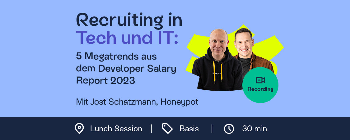Um die wichtigsten Insights zu teilen und zu erläutern, haben wir Jost Schatzmann, Managing Director bei Honeypot eingeladen. In der gewohnten kurzen und knackigen 30-minütigen Lunch Session wird Jost zusammen mit Adrian Krastev, Teamlead bei der New Hiring Academy, auf die wichtigsten Erkenntnisse aus der Studie eingehen.